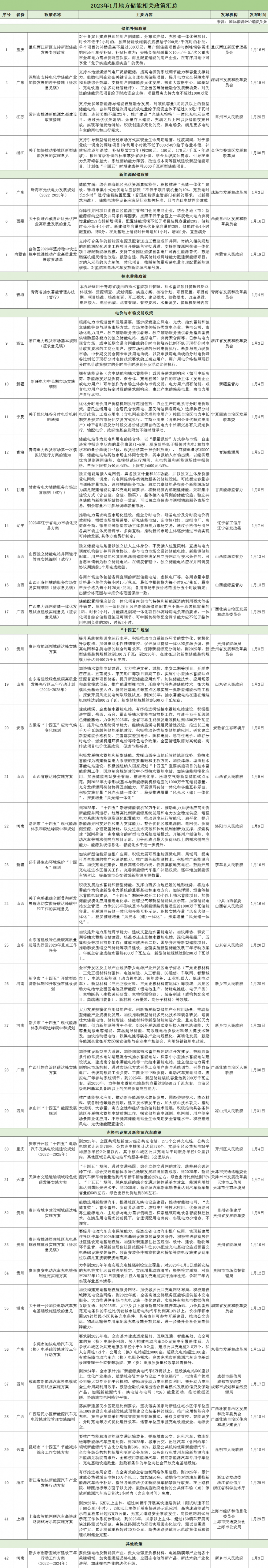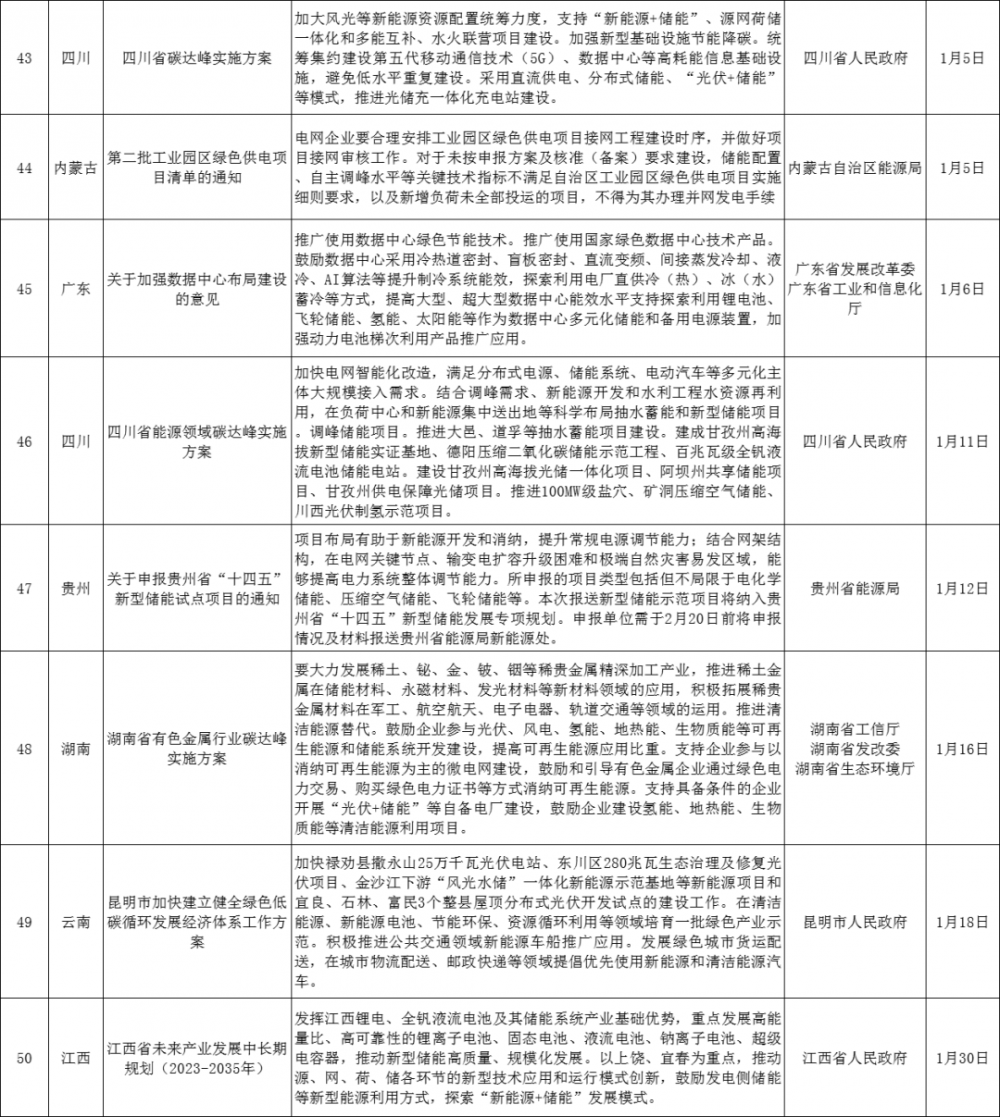 地方层面,贵州、广东、河南、山西、四川、广西、浙江、湖南、内蒙古、青海、山东、新疆、云南、重庆、安徽、甘肃、江苏、江西、辽宁、宁夏、上海、天津、西藏23个省市发布储能相关政策50条。